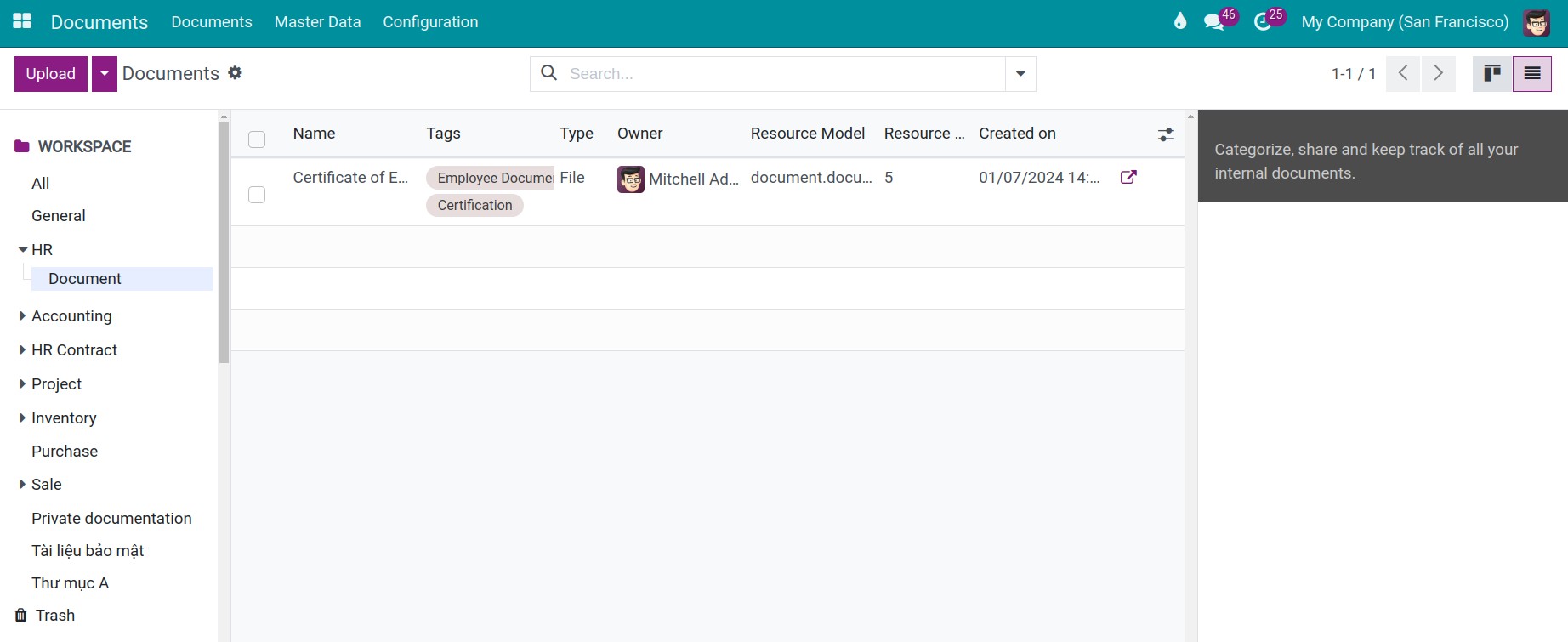 Odoo Documents app supports centralized management of attachments that are scattered on the system or documents uploaded from other sources.